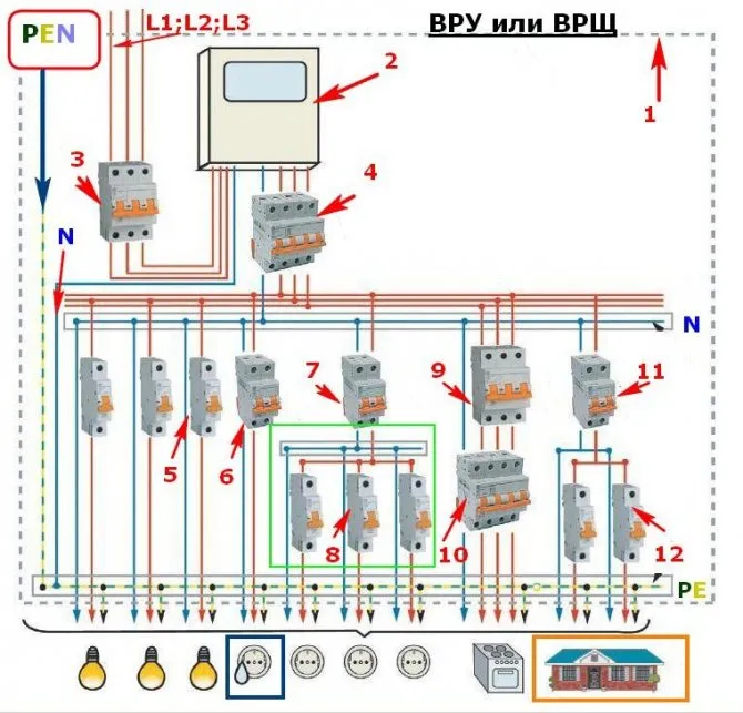 При трехфазном питании на фасаде дома устанавливается вводно-распределительный щит (ВРЩ). Именно в нем производится разделение PEN проводника и установлены вводной автомат, а также автоматы защиты для групповых цепей дома.