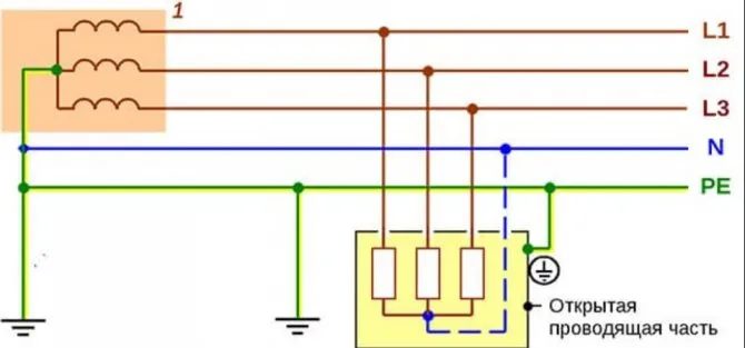 - передача напряжения от трансформаторной подстанции производится по ЛЭП (четыре провода), которые включают три фазных жилы (L1, L2, L3) и один общий нулевой провод PEN;
