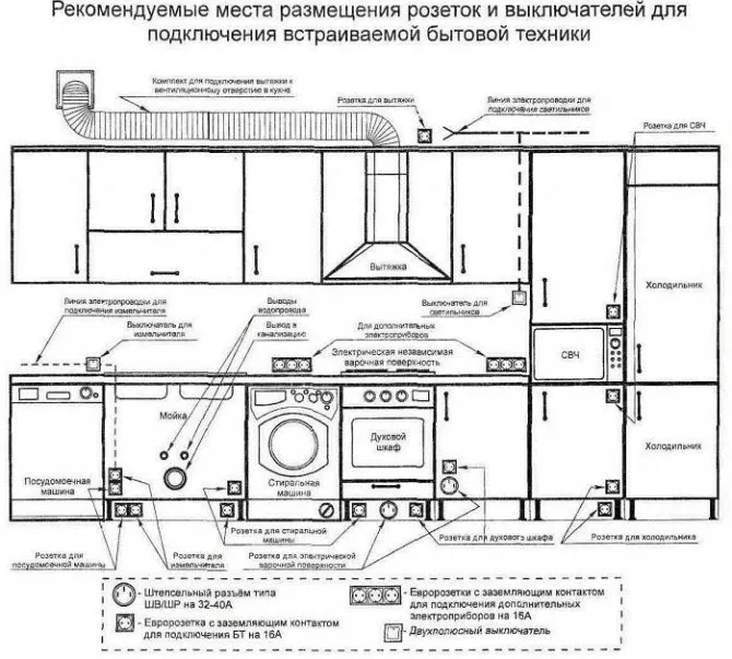 Безрозеточные соединения, например, у духового шкафа, производят под столешницей, возле стены, тогда как розетки для тостера, электрочайника, мультиварки, комбайна лучше вынести над рабочим столом.
