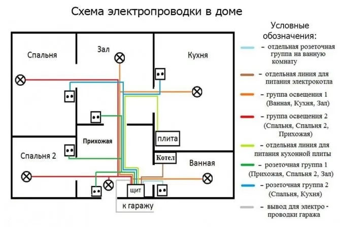 Обязательно обозначается точка ввода силовой линии в дом и место установки электрощита. Затем, на отдельных линиях, следует отметить распределительные коробки, электроустановки, осветительные приборы.