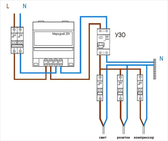 Если не брать в учет счетчик, на электрощитке останутся входные автоматы защиты, шина заземления, УЗО на 20 А, три контурных автомата: на линии освещения, для розеток и для компрессора. Дополнительное мощное оборудование также нуждается а автоматической защите.