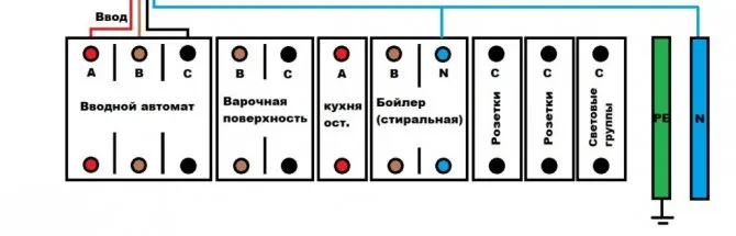 Конечно, это приведена типовая схема распределения. Возможно, вы вообще не любите готовить и у вас есть только микроволновка. Также все относительно по поводу котельного оборудования, но результат везде должен получаться одинаковый. Мощность электроприборов распределяется равномерно по трем фазам, желательно, чтобы двух разных фаз не было в одной комнате. Если так не получается разводите их по противоположным сторонам помещения.