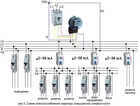 Во помещениях с повышенным уровнем влажности нужно использовать дифавтомат (6), у которого срабатывание производится при достижении током показателя не более 30 миллиампер.