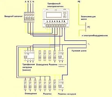 Силовой щит рекомендуется устанавливать на фасад здания, далее провода идут уже от него по всем помещениям. При наличии электрифицированных пристроек, питающая линия подводится к ним также от щитка. Для подключения и учета потребленной электроэнергии необходим трехфазный счетчик. В основном используются устройства прямого включения, принцип работы которых напоминает однофазный счетчик. В этом случае требуется всего лишь правильно соблюдать схему подключения устройства, размещенную на его задней крышке или в техническом паспорте.