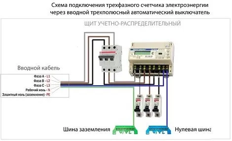 Трехфазное подсоединение основывается на подведении всех жил к вводному аппарату объекта. Далее ток попадает на устройство учета и проходит в распределительный щиток, с целью последующей разводки по электроприемникам.