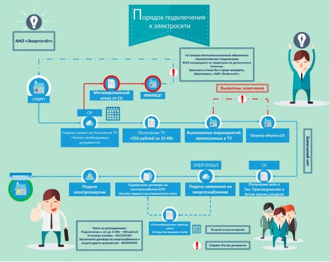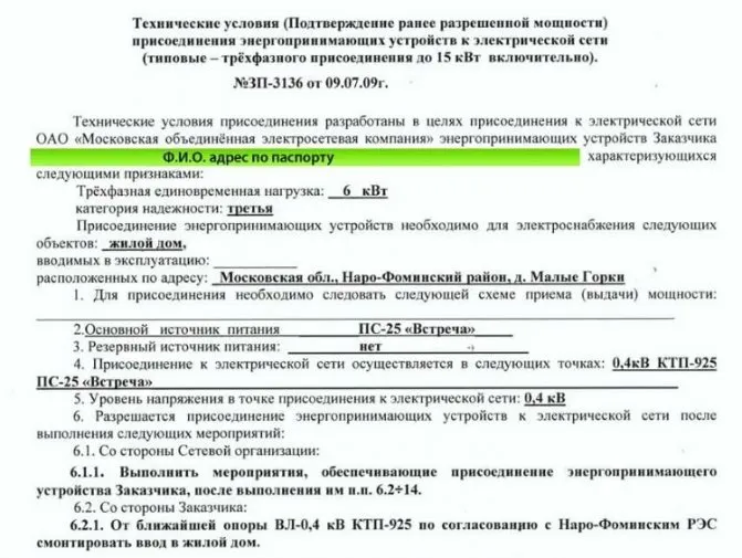 Компания должна выдерживать сроки принятия решений по заявке. Для физлиц с требуемой мощностью до 15 кВт такой срок равняется 15 суткам, с другими показателями или для временного подсоединения — до 30 суток. После подписания договора на руки выдают ТУ, которые пользователь должен в точности выполнить на своем участке.