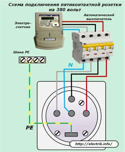 Особенность розеток на 380В в том, что они блокируют от несимметричного подсоединения, чтобы избежать КЗ. Контакты размещены под углом, они разные по размеру, с направляющими элементами.