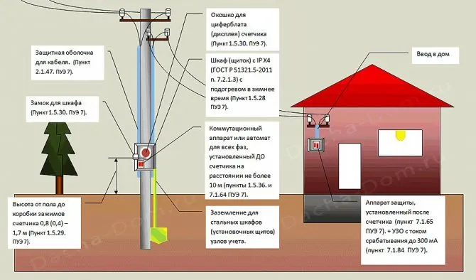 В подключении частного дома к электроснабжению чаще всего используется воздушный ввод (что тоже указано в ТУ) с установкой шкафа учета электроэнергии (ШУЭ) для исключения случаев хищения электроэнергии и проблем сдачи электроснабжения на коммерческий учет.