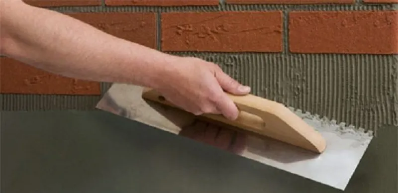 - Далее, на стену шпателем наносится клей слоем в 3÷4 мм. После этого масса распределяется зубчатым шпателем, который оставляет равные по высоте бороздки, обеспечивающие максимально равномерное распределение клея при прижатии плитки. При укладке некоторых тяжелых видов плитки (того же клинкера), клей дополнительно рекомендуют наносить и на тыльную сторону облицовочного материала. Поэтому перед началом работ следует обязательно изучить инструкцию, прилагаемую к упаковке, в которой уточнены нюансы монтажа конкретного материала.