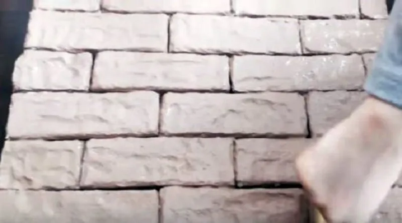 - После этого трафарет прижимается к нанесенной свежей штукатурке и аккуратно прижимается, так, чтобы на ней остался рельеф кирпичной кладки.