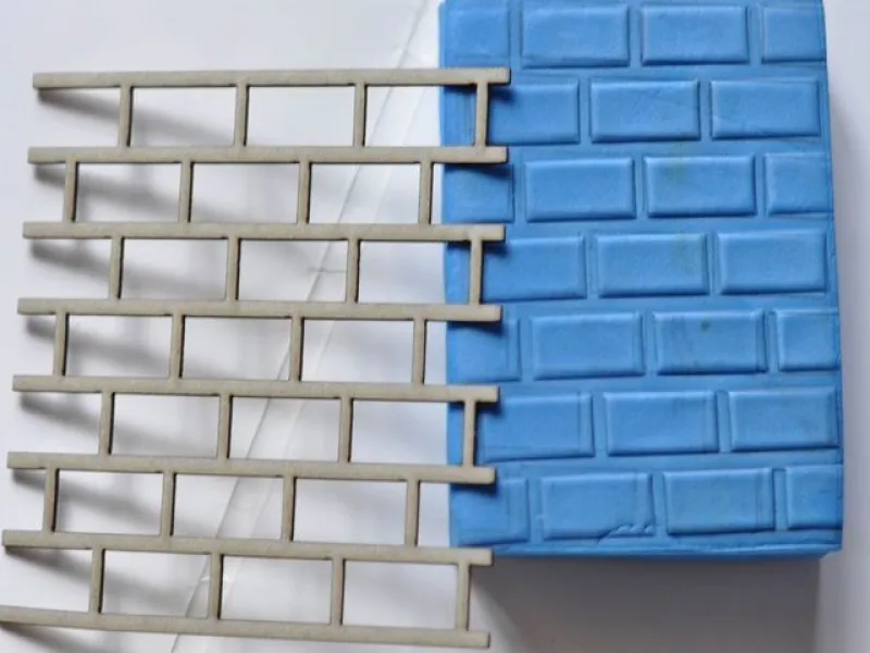 - Затем материал разрезается на отдельные элементы канцелярским ножом. Количество таких блоков должно соответствовать числу кирпичей, необходимых для оформления определенного участка стены, на котором была произведена разметка.