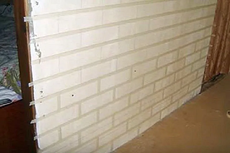 - Первым шагом подготовленная поверхность облицовываемой стены расчерчивается под кирпичную кладку.