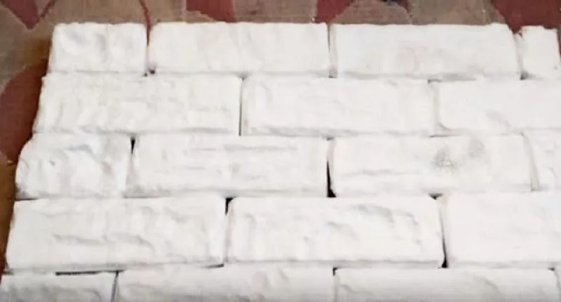 - Далее, трафарет снимается и прикладывается далее, рядом с только что продавленным рельефом. Здесь нужно постараться и приложить его так, чтобы кладка была ровной, и не получился перекос ее горизонтальных швов.