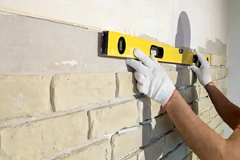 - Разметка поверхности стены проходит таким же образом, как и для монтажа любого штучного облицовочного материала: отбиваются ровные линии по верхнему и нижнему уровню кладки, затем, рекомендовано все расстояние между ними, рассчитать и разделить горизонтально так, чтобы в этой области могли разместиться намеченное число рядов кладки, с обязательным учетом толщины швов между ними. Особенно важно провести этот процесс в том случае, если нет достаточного опыта по облицовке стен – разметка поможет сделать кладку идеально ровно.