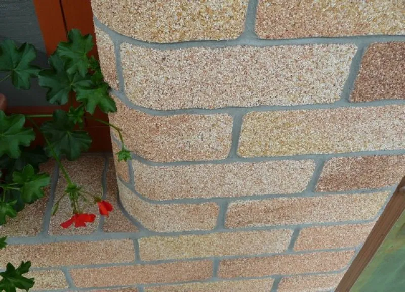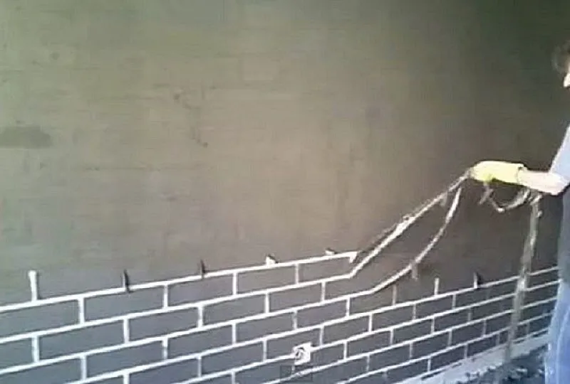- После нанесения раствора полностью на всю стену, по нему можно пройтись рукой во влажной резиновой перчатке, чтобы создать фактурность поверхности. Если же планируется оставить поверхность «кирпичей» ровной, то трогать слой раствора не стоит.