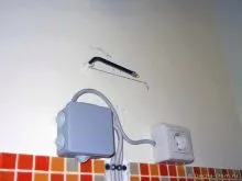 - для моделей подвесного типа — над верхней панелью, вблизи воздуховода, тогда питающий шнур будет располагаться вне района видимости;