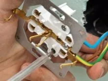- Подключить новую розетку. Вначале требуется подсоединить подводящий провод к контактам. Для этого приблизительно на 5-10 миллиметров удаляется изоляция с проводящих ток жил кабеля. Обнаженная часть кабеля запускается в клемму и крепко фиксируется винтом. При закручивании винта не надо прикладывать неимоверных усилий, иначе можно пережать кабель. Если осуществляется подсоединение розеток с «землей», жила заземления подсоединяется к надлежащему контакту (заземляющему контакту). Данный контакт связывается с заземляющими «усами». Перед подсоединением заземляющей жилы кабеля надо удостовериться, что как раз эта жила и есть «земля».