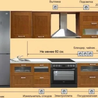 - Наименьшая дистанция от точки электрического питания до мебели, имеющейся на кухне (столешница, шкафы, полки) — 5 сантиметров.