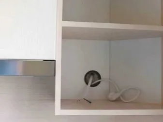 В первом случае (подвесные или встраиваемые кухонные вытяжки) удобнее всего расположить розетку в навесном шкафу или прямо над ним.