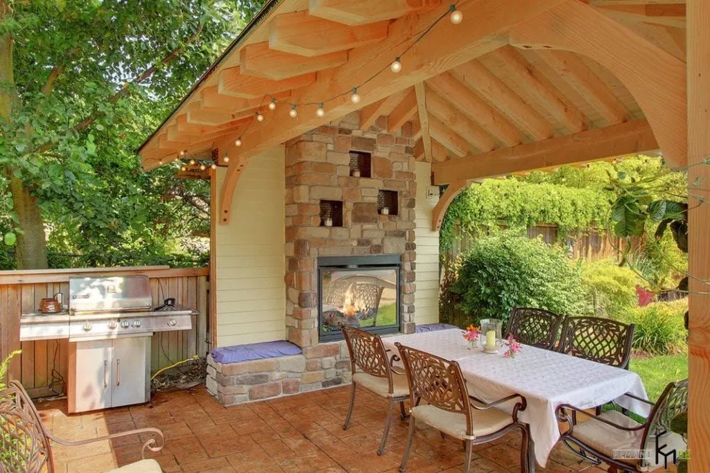 Есть несколько видов открытых летних кухонь: навес, веранда, беседка, павильон, патио, пергола.