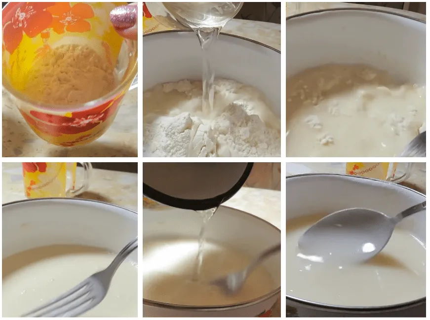 Для приготовления возьмем 6 литров воды и двухлитровую банку муки.