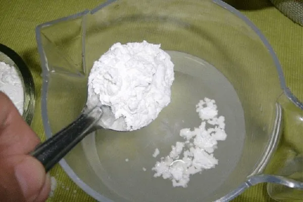 - Первым делом подготовьте крахмал. Тщательно просейте, что сведет к минимуму вероятность появления комочков. Подготовленное сырье залейте теплой водой и перемешайте. В итоге получится масса, напоминающая жидкое тесто.
