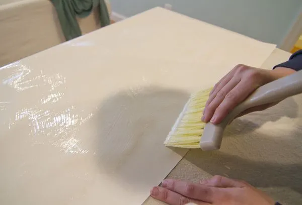 Обои следует наклеить на стену ровно, избегая образования пузырей и предварительно промазав поверхность клеем на расстоянии полосы. Наносите средство на полотно равномерно и, прикладывая материал к стене, сверху вниз разглаживайте полосу обоев специальным валиком. Задача мастера заключается в том, чтобы не допустить скопления воздуха под полотнищем. Излишек клея, появившийся на лицевой стороне обоев, следует немедленно стереть влажной тряпкой.