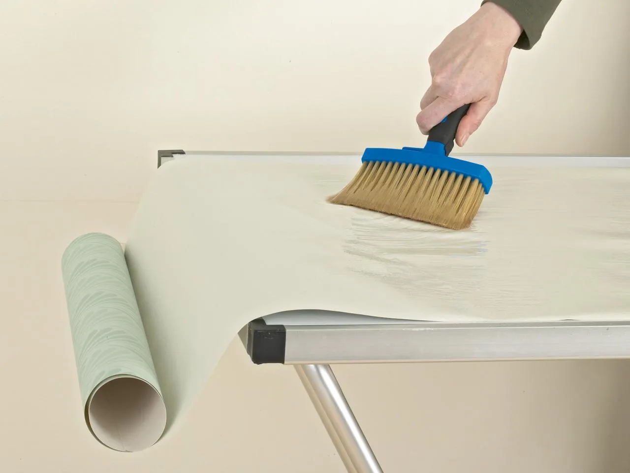 Обои следует наклеить на стену ровно, избегая образования пузырей и предварительно промазав поверхность клеем на расстоянии полосы. Наносите средство на полотно равномерно и, прикладывая материал к стене, сверху вниз разглаживайте полосу обоев специальным валиком. Задача мастера заключается в том, чтобы не допустить скопления воздуха под полотнищем. Излишек клея, появившийся на лицевой стороне обоев, следует немедленно стереть влажной тряпкой.
