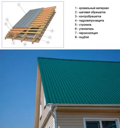 Наименьшим углом наклона следует считать такой угол, при котором между гофрами не происходит перелива воды, а на крыше не возникает луж. Необходимо также учитывать тяжесть снега на кровлю, его способность набиваться в кровлю.
