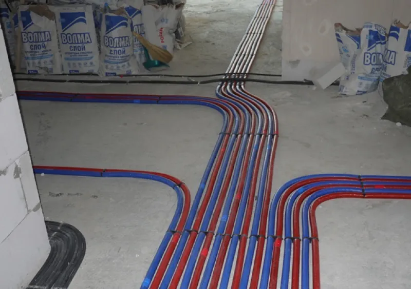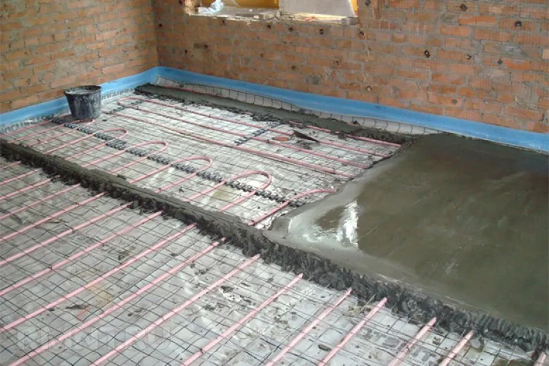 - Прежде чем начинать работы по укладке стяжки, следует убедиться, что трубы теплого пола находились под рабочим давлением, но холодными. Это очень важно! Проверяется надежность их крепления. в тех местах, где делаются деформационные швы, на трубы должна быть надета теплоизоляция или гофра.