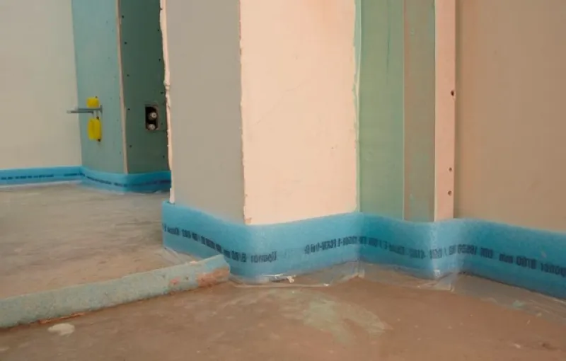 - По периметру помещения на стены наклеивается демпферная лента, служащая для компенсации температурных расширений.
