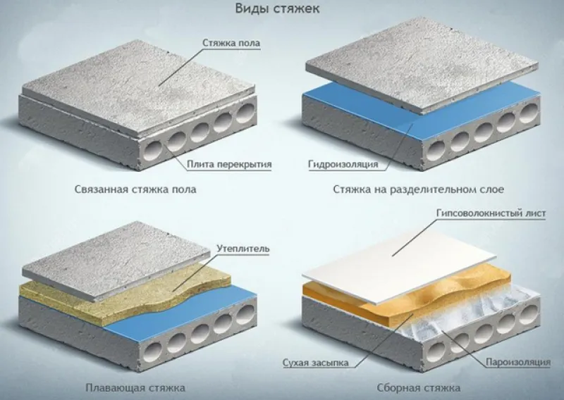 Стяжка может укладываться на разных основаниях: уплотненный грунт, бетон или даже дерево. В зависимости от связи с основаниями стяжки можно разделить на следующие виды: