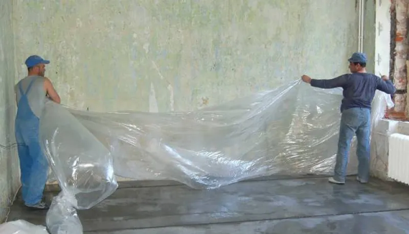 - В теплую и жаркую погоду надо исключить быстрое испарение воды из стяжки, для этого на 2—3 день поверхность увлажняют и накрывают пленкой. Это необходимо делать в течение 7—10 дней, чтобы все реакции цемента с водой прошли без ее недостатка.