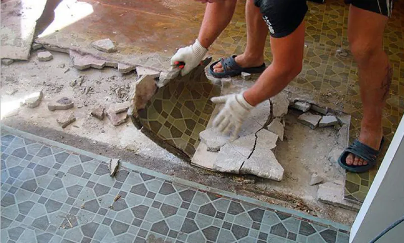 Бывает, что после демонтажа стяжки обнажается «культурный слой» с уложенной на полу керамической плиткой. Причем бывает, что эта плитка была уложена еще в 50—60-х годах прошлого века. На форумах по строительству и ремонту очень часто встает вопрос о том, что с этой плиткой делать? Отбивать ее или нет? Мнения по этому вопросу разнятся. Наше мнение однозначно – отбивать!