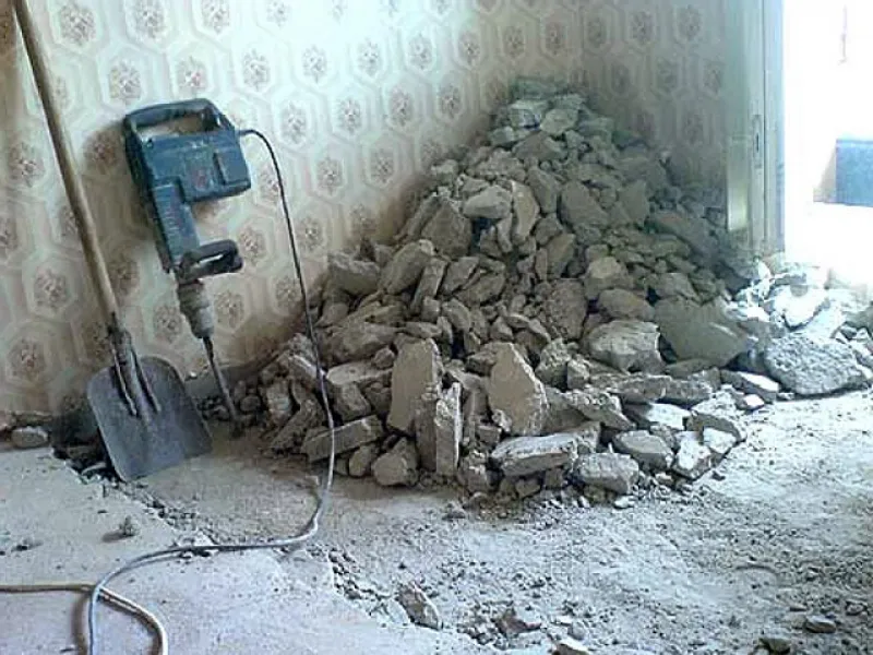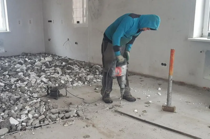 Для демонтажа стяжки лучше всего вызвать бригаду работников, специализирующихся именно на этом. По опыту – так выйдет гораздо дешевле. Не стоит даже и пытаться делать это в одиночку, так как будут измучены и хозяева, и соседи, если снятие стяжки будет в многоквартирном доме. Профессиональная бригада сразу приезжает со всем необходимым долбежным и камнерезным оборудованием, лопатами, мешками для мусора, пылесосом. Весь собранный при долбежных работах мусор они сразу увозят и хозяину не надо заботиться о вызове отдельной машины. Работа у профессионалов идет в беспрерывном режиме: один или два человека долбят, еще один или два сразу собирают мусор в мешки, а остальные выносят и грузят его в машину.