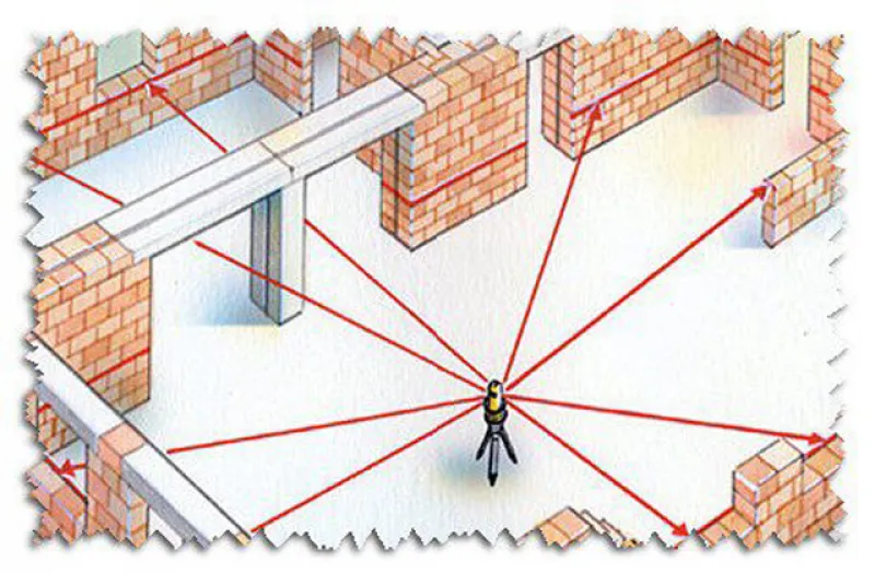 - В определенном месте устанавливается на штативе лазерный уровень так, чтобы он своим лучом мог захватить максимальное количество помещений. Лучше его установить на комфортной для работы высоте – примерно 140—150 см. На стенах помещений делаются маркером отметки положения луча.