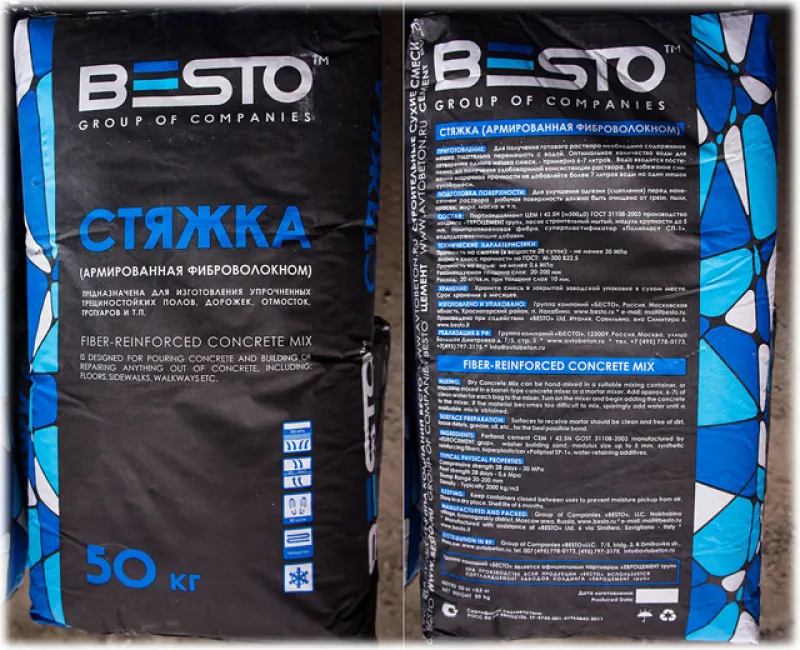 - Кроме цемента и песка в состав сухих смесей для стяжек пола уже входят различные добавки для уменьшения усадки, улучшения адгезии, пластификаторы, а в некоторые их марки и фибра.