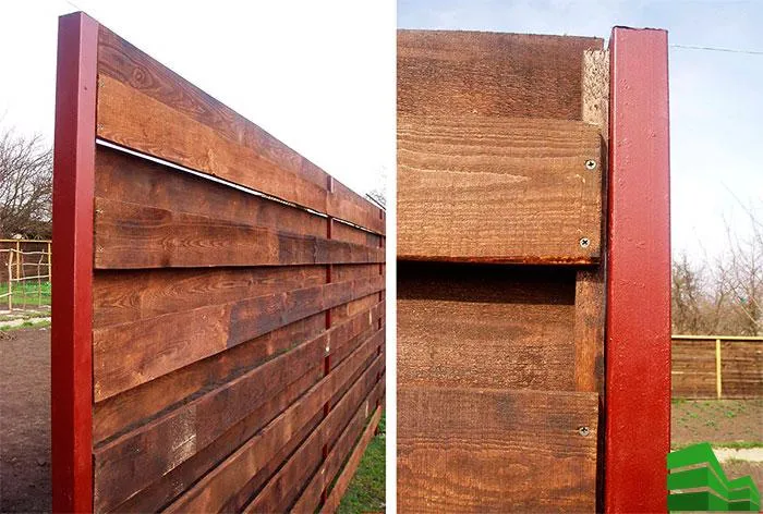 - Вертикальная. Самая распространенная схема крепления реек. К опорным столбам крепят горизонтальные деревянные лаги, на которые в дальнейшем «собирают» полотно ограды.