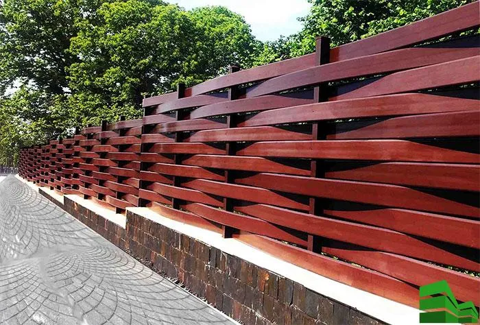 - Подобие тына. В этом варианте забор напоминает плетеное ограждение и одновременно горизонтально расположенные доски. Доски выгнуты, с обеих сторон выгибают столбы и чередуются в шахматном виде.