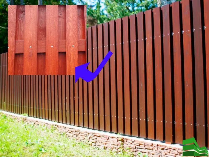 Его название происходит из-за схожести с деревянным штакетным забором. Фактически это ограда, созданная из профлиста, разрезанного на узкие полосы. Она изготавливается из оцинкованного металла толщиной от 0,5 до 2 мм и покрывается двумя слоями цветного полимерного покрытия. Этот вид ограды также известен как забор «шахматка».