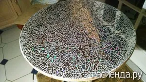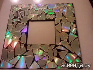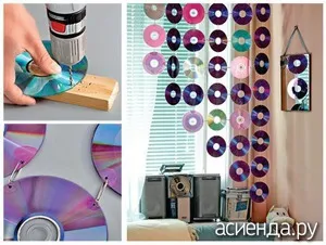 Многие декорируют цветными кусочками элементы мебели, обклеивают столешницу журнального столика, делают настенные панно-мозаики. Из целых дисков создают декоративные шторки, контейнеры для мелочей, подставки для стаканов.