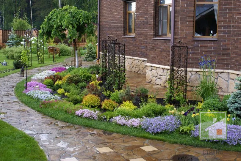Распространенной ошибкой является устройство прямой дорожки, пересекающей весь участок. Сгладить такой вариант (если другая форма невозможна), помогут посаженные рядом с ней кустарники и цветы. Чтобы пространство полностью не просматривалось, его можно разделить при помощи арок из вьющихся растений или живой изгороди.