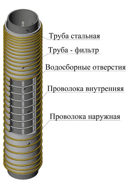 Скважина не может эксплуатироваться без фильтровального комплекса. В конструкции обязательно располагается колонна, в которой имеется сетка для грубой очистки воды и перфорация. Перфорированный сектор дополняется фильтрующим слоем. В конструкции фильтрующей системы присутствует отстойник, в котором оседает шлам. Фильтр в колонне может быть щелевым или с дырчатой перфорацией.