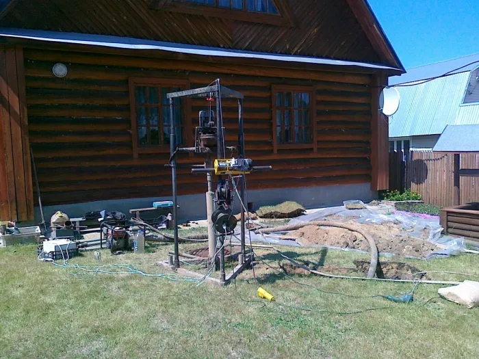 - Необходимо обустроить буровую вышку. Она может представлять собой треногу, собранную из бревен и труб. Могут использоваться и полупрофессиональные вышки. Их часто берут напрокат для выполнения скважин на частной территории.