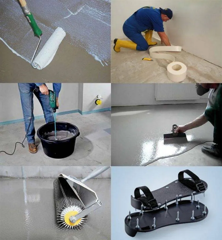 Как только смесь полностью покрыла площадь, игольчатым валиком нужно пройти по поверхности. Он распределит жидкости равномерно и удалит пузырьки воздуха.