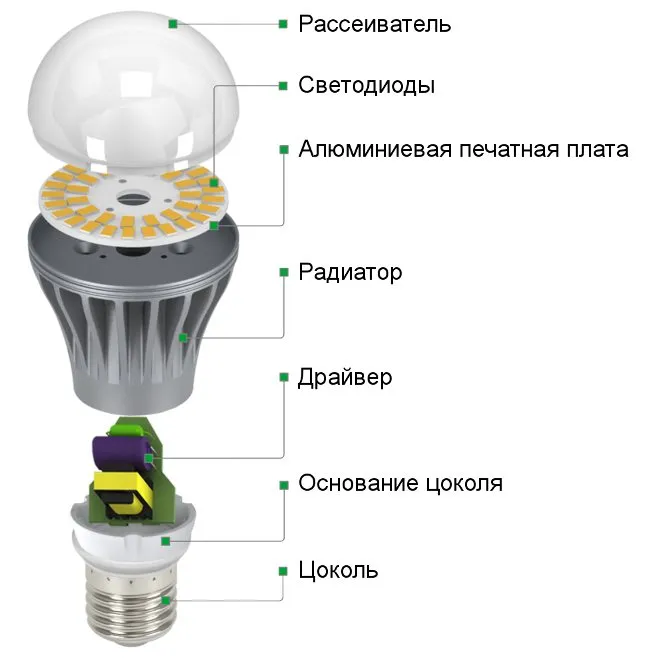 - Светодиоды. Являются главным рабочим элементом. Благодаря им лампа светится.
